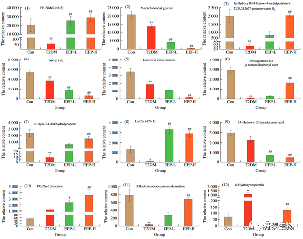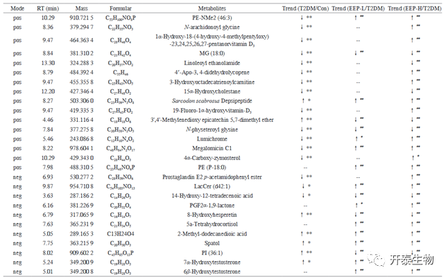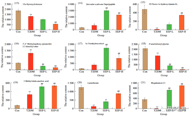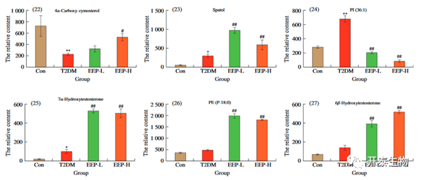 代谢组分析一共鉴定出27种潜在代谢标志物,其中11种为负离子筛选,16种为正离子筛选,这些代谢物主要参与甾醇脂质、脂肪酸、甘油磷脂、甘油脂质等代谢通路(表1)。与对照组相比,T2DM小鼠中有16种代谢物显著降低,7种显著增加,4种水平接近。而在EEP治疗后,与T2DM组相比,EEP-L组的6种代谢物显著降低,12种显著增加,9种无显著变化;EEP-H组有8种显著降低,19种代谢物显著增加(图6)。