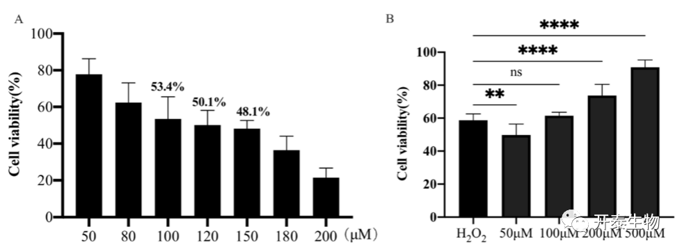 使用120 µM H2O2处理细胞4小时,以此建立氧化应激模型。和对照组相比,H2O2处理后细胞活力降低到50.1%(图1A)。使用不同浓度的MT (50、100、200和500 µM) 预处理PTr2细胞24 小时,然后再使用120 µM H2O2 处理4小时。结果表明,使用500 µM的MT预处理,可以显著增强H2O2 处理的PTr2细胞的活力(图1B)。
