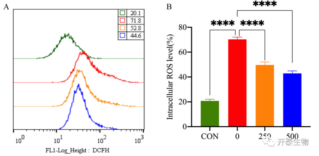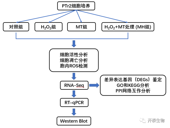 为了探究MT的抗氧化活性,作者检测了PTr2细胞内ROS的含量。结果表明,H2O2处理可以显著升高细胞内ROS含量,但500 µM的MT预处理可以显著减少ROS产生(图3)。