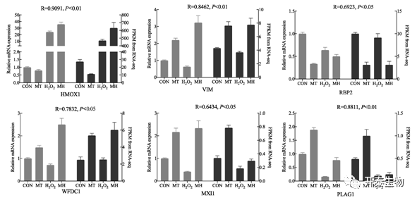 为了验证测序结果的准确性,作者选取了6个DEGs(HMOX1、VIM、RBP2、WFDC1、MXI1、PLAG1)进行RT-qPCR验证,结果和测序数据一致(图6)。