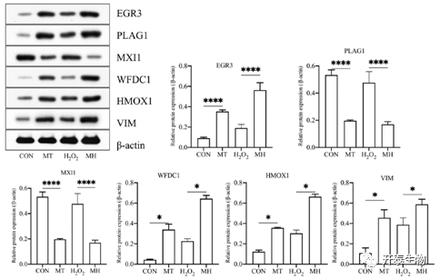 为了研究MT对H2O2诱导的PTr2细胞氧化应激的影响,作者选取EGR3、PLAG1、MXI1、WFDC1、HMOX1和VIM等6个蛋白进行Western blot分析。如图7所示,与对照组相比,MT组EGR3、HMOX1、VIM和WFDC1蛋白显著上调;与H2O2组相比,MH组EGR3、HMOX1、VIM和WFDC1蛋白显著上调。然而,PLAG1和MXI1的表达水平在MT组显著低于对照组,在MH组显著低于H2O2组。