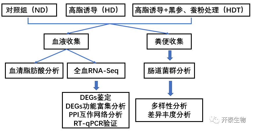 本研究通过比较转录组学和肠道微生物组分析,发现饮食补充黑参、蚕粉可以改变犬肥胖相关基因的表达以及微生物组成的多样性。结果表明,黑参和蚕粉补充剂可作为一种膳食干预措施,来改善饮食诱导的肥胖及相关疾病。