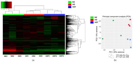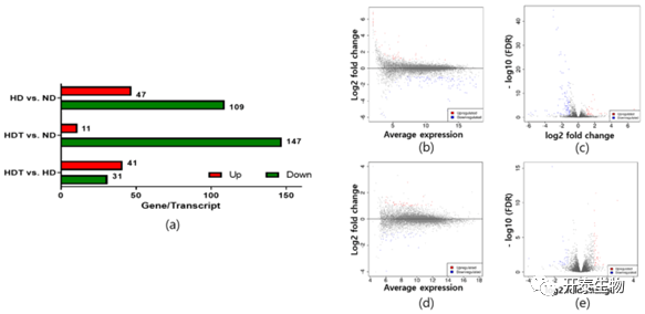 测序共获得超过98%的高质量reads,参考基因组比对率大于95%。差异表达基因(DEGs)聚类分析显示同一组内样本聚集在一起(图2a)。PCA分析表明,HD和HDT组内样本各自聚集且组间明显分离,但ND组内样本聚集比较松散(图2b)。和ND组相比,在HD组中共获得到47个上调基因和109个下调基因,而在HDT组中获得到11个上调基因和147个下调基因;和HD组相比,在HDT组中共获得到41个上调基因和31个下调基因(图3a-e)。