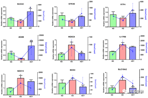 使用RT-qPCR验证测序数据的准确性,选择NUGGC、ACAN、HOXC4、IL17RB、SOX13、SOX4、EFR3B、RTP4和SLC18A2进行检测,结果和测序数据一致,表明测序数据是可靠的(图5)。