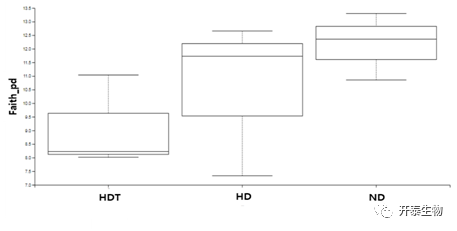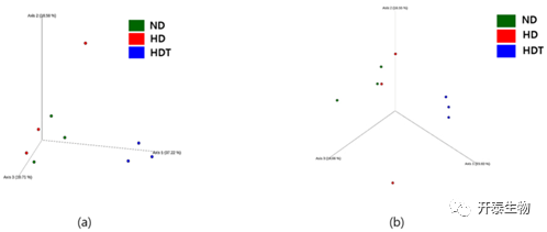 作者进一步评估了微生物群落的多样性和丰度。采用Faith系统发育多样性和PieLou均匀度指数来计算α多样性,结果表明,ND和HDT组之间的PieLou均匀度指数差异显著,在其他组之间比较差异不显著。但和ND组相比,HD组的Faith系统发育多样性下降,而在HDT组中则进一步下降(图6)。使用基于Bray-Curtis距离的主坐标分析β多样性,尽管ND组和HD组有一个重叠的区域,HD组的一个样本在一个较远的位置,但每个处理组都聚集在一个相对独立的区域(图7a)。从Jaccard距离生成的三维图中也观察到类似的聚类模式(图7b)。