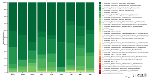 通过生成条形图和Krona图对分类结果进行分析。用Krona图比较不同处理组肠道微生物中存在的重要分类群(图8)。在门水平上,所有样本中最主要的是厚壁菌门。而梭杆菌门、拟杆菌门和放线菌等,在不同样本间普遍存在。LEfSe分析确定了ND和HD组之间的微生物群落分类差异。在HD组中,梭菌纲、梭菌目、链状杆菌属和梭菌属的成员增加;螺旋杆菌科、乳酸杆菌科、弯曲杆菌目、ε-变形菌纲和螺杆菌属的成员减少(图9a,b)。然而,HD和HDT组之间的分类群没有变化。