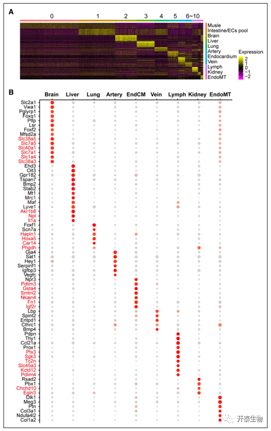 收获第 14.5 天 (E14.5) 阶段四个野生型胚胎,获得 5806 和 6278 个 eEC(胚胎内皮细胞)并整合在一起。通过聚类分析确定了 11 个簇,并且从 M1和 M2分离的细胞得到了很好的整合(图 1A)。在各种器官或组织中建立的内皮细胞标记用于注释每个簇(图 1B)。脉管系统中的 EC 由血管 EC 和淋巴 EC 组成。大血管中的内皮细胞进一步分类为动脉内皮细胞和静脉 ECs。Foxf1 在肺 ECs38中高度表达,肾 EC 表达更高的基因Pbx1,Npr3 是心内膜的标记基因。Stab 2、Gata4 和 Oit3 在肝 ECs中高度表达。来自心脏的部分 aEC 与定义为心内膜的 eEC 重叠,这与心脏中 EC 的解剖分布一致。某些基因(肌肉中的 Actb、Fabp4和肠道 EC 中的 Apq710)分别在簇 0 和簇 1 中富集(图 1B)。作者推测簇 0 为肌肉 eEC,簇 1 为肠ECs 池。利用已发表的成年小鼠数据集,作者在图 2B 中用红色字体突出显示了一些基因,与 aECs 相比,这些基因在 eECs 中的表达相对较高。