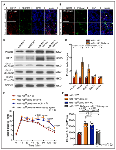 MiR-126-HIF1A-GLUT1 通路参与糖代谢,用 miR-126 Agomir (激动剂)治疗可挽救 miR-126-ecKO 小鼠的血糖失衡