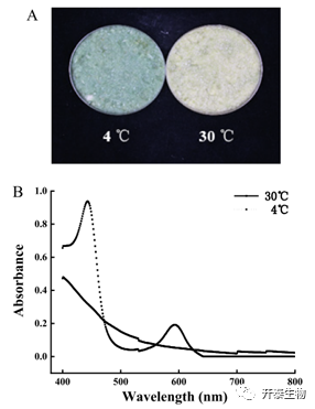 将大蒜分别保存在4℃和30℃条件下,发现4℃保存大蒜呈绿色,而30℃保存大蒜呈白色(图1A)。紫外光谱分析结果表明,30℃保存的大蒜紫外可见光谱平滑,无吸收峰。而4℃保存的大蒜在440 nm和590 nm处出现两个吸收峰,它们分别代表黄色素和蓝色素的最大吸收峰(图1B)。