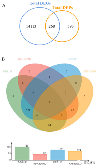 图4 大蒜样品中总的DEGs、DEPs(A)和共享因子(B)的联合Venn分析