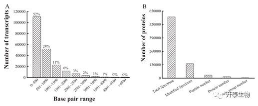 转录组测序结果显示,一共从6个样本中获得309828070个Raw reads,并从中筛选出303017124个Clean reads,6个样本的Q20和Q30的平均值分别为98.51%和95.37%,GC含量均大于43%(表1),这表明测序数据质量高,可用于后续分析。进一步对测序数据组装,发现长度在0到500 bp之间的转录本数量最多,约占52%,而只有624个转录本的长度在4001到4500 bp之间(图2A)。此外,蛋白质组测序结果显示,在6个样本中共鉴定了29987个肽,15163个蛋白质和5232个蛋白groups(图2B)。