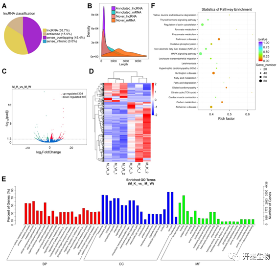 新筛选的 lncRNA 根据它们与已知 mRNA 的位置关系分为四种类型(图 2A)。新的lncRNA符合转录本的一般特征(转录本长度大于200 nt,外显子数大于等于2(图2B))。分析XBP1 敲除小鼠和对照之间 lncRNA 表达模式中的 DEG,包括 334 个上调基因和 107 个下调基因(图 2C)。对 441 个差异表达 lncRNAs 进行了层次聚类分析,将 XBP1 敲除小鼠和野生型小鼠的表达模式分为不同的簇(图 2D)。对lncRNA 进行靶基因预测并对靶基因进行功能富集分析。共表达和共定位的预测结果提取了 841 个核心 GO条目(图 2E),在BP类中,如细胞代谢过程、初级代谢过程、有机物代谢过程。CC类别,细胞部分、细胞内部分、细胞器、细胞内细胞器和细胞质相关,MF类别,蛋白质结合、离子结合、催化活性。为了进一步关注这些 lncRNA 的功能,通过KEGG分析,差异lncRNA显著富集在帕金森病 (PD)、亨廷顿病 (HD)、碳代谢和扩张型心肌病 (DCM)(图 2F)。