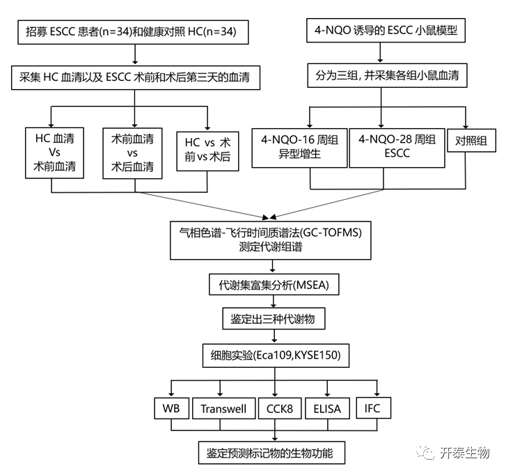 食管鳞状细胞癌(ESCC)是食管癌(EC)的主要组织学亚型,预后不良。由于早期缺乏特定的表现,多数患者确诊时已处于晚期,因此寻找新的预测标志物以期早期诊断是提高患者治疗效果的关键。肿瘤细胞在肿瘤的发生、发展和转移过程中需要大量的能量和原料,从而扰乱新陈代谢。因此,外周血中的异常代谢产物可用于癌症诊断、疗效评估和患者预后的预测。在这项研究中,作者对ESCC患者食管切除术前后及健康志愿者血清进行代谢组学研究,以期发现ESCC肿瘤相关的代谢改变,并利用处于异型增生和ESCC阶段的小鼠血清验证其相关改变,识别具有预测潜力的生物标志物。