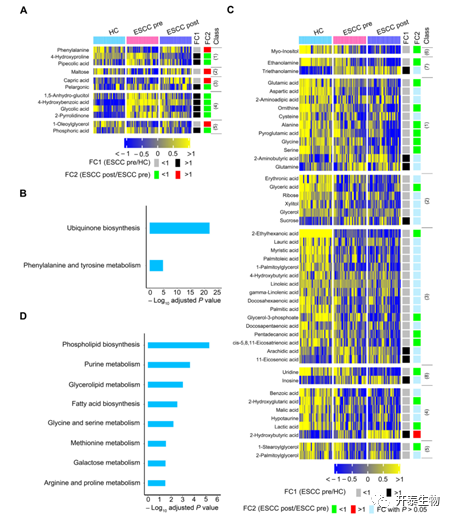 接下来,作者对HC组、术前组和术后组进行了综合分析,选择了58种代谢物(图1C)来鉴定ESCC肿瘤相关的代谢改变。如图3A所示,术后ESCC血清中的12种代谢物向HC方向恢复,这表明肿瘤特异性调节了这些血清代谢产物。这些代谢产物在两个途径中富集,包括泛醌的生物合成途径,以及苯丙氨酸和酪氨酸的代谢途径(P<0.05)(图3B)。图3C的热图显示,术后血清中剩余46种代谢产物的水平沿相反的HC方向变化,或者与术前相比没有显著变化。因此,可以认为这46种代谢物不受ESCC肿瘤的特异性调节。值得注意的是,这些代谢物在八种途径中都富集 (P<0.05)(图3D)。
