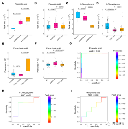 随后,作者通过综合分析ESCC小鼠和患者的血清代谢数据,鉴定了三种在小鼠和人类之间保守的代谢物。首先,在正常对照组、异型增生和癌变的小鼠血清中哌可酸的浓度逐渐增加(图6A)。而且,哌可酸水平在术前患者中显著升高,但在术后患者中降低(图6B)。其次,小鼠血清中的油酸甘油酯的丰度从正常对照到癌变逐渐降低(图6C),术前患者血清中该代谢物明显受抑制,但在术后患者中却上调(图6D)。此外,与对照组相比,异型增生小鼠血清磷酸水平没有受到影响,而在癌变阶段磷酸水平显著升高(图6E),相应地,其在术前患者显著增加,在术后患者下降(图6F)。