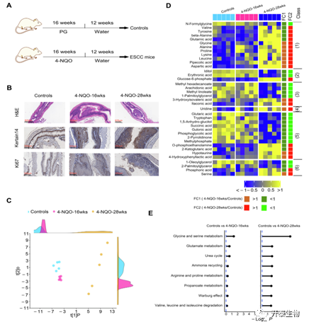 A.4-NQO诱导的从异型增生到ESCC小鼠的方案;B.对照组和4-NQO处理小鼠食管组织的HE和IHC染色图像;C. 对照组、4-NQO-16周4-NQO-28周小鼠血清代谢谱;D.小鼠从正常对照到癌变阶段血清代谢物进行性变化的热图; E.代谢途径富集物分析。
