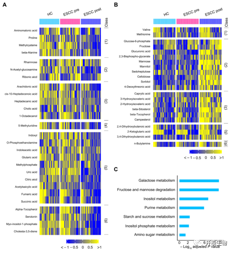 ESCC患者从术后第1天开始禁食和持续性肠外营养,术后第3天采集血清,并与术前进行对比,发现术后血清表现出明显的代谢改变, (R2Y=0.84,Q2=0.76)(图2A),有 78种代谢产物的水平发生了显著变化(P<0.05),包括16种氨基酸、16种碳水化合物、18种脂质、2种核苷、19种有机酸和7种未分类代谢产物(图2B),这表明食管切除加上术后禁食和肠外营养可能对ESCC患者的整体代谢产生明显影响。随后,作者对这78种代谢物进行了MSEA,与术前相比,术后血清中10条代谢途径的活性显著波动(P<0.05)(图2C)。值得注意的是,半乳糖代谢是最受干扰的途径,参与这一途径的五种代谢物中有四种的水平增加,而术后血清中剩余代谢物的丰度受到抑制(图2D)。