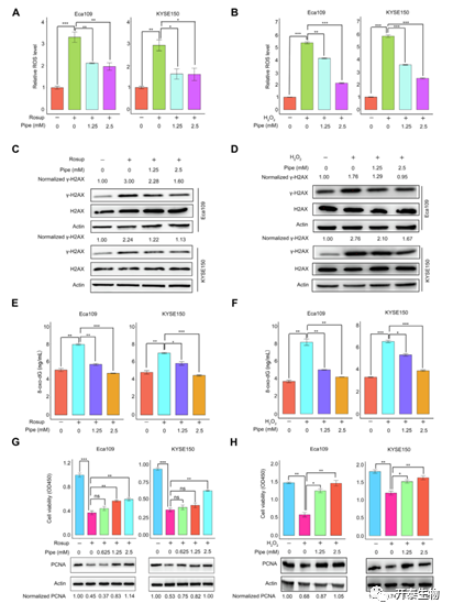 哌可酸对Rosup或H2O2诱导两种细胞 (A,B)ROS产生的影响; (C,D)c-H2AX表达的影响; (E,F)8-oxo-DG产生的影响;(G,H)细胞增殖及增殖细胞核抗原表达的影响。