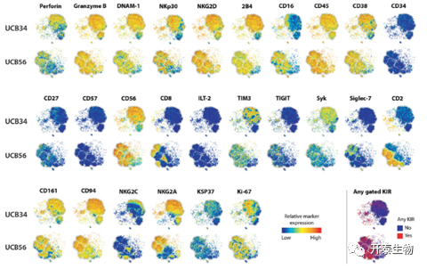 图1 质谱流式分析UCB34和UCB56 NK细胞表型