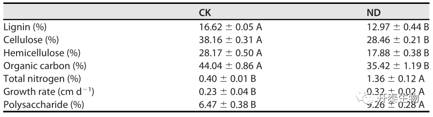堆肥的木屑颜色由棕红色变为深褐色。与新鲜(CK)木屑相比,堆肥(ND)木屑的纤维素、木质素、半纤维素和有机碳含量较低,而总氮含量较高(表1)。ND组香菇的菌丝生长速度快,褐膜多糖含量高于CK组(表1)。另外,ND组香菇的褐膜开始形成的时间比CK组早,褐膜完全形成的时间比CK组早14天,说明木屑堆肥促进了香菇的生长。
