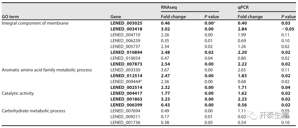 使用RT-qPCR检测了18个DEGs的表达水平,其中9个基因的差异倍数及显著性和测序数据一致(表2)。