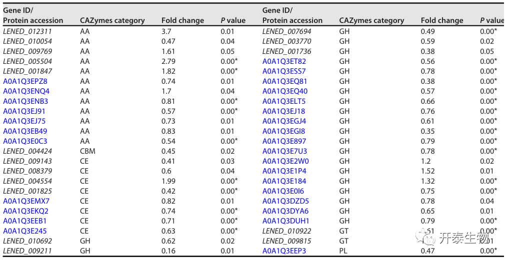 转录组中7.2%的DEGs是编码碳水化合物活性酶的基因。其中,1个碳水化合物酯酶,1个糖基转移酶和4个辅助酶基因上调;5个糖苷水解酶,3个碳水化合物酯酶,1个碳水化合物结合域,1个糖基转移酶和1个辅助酶基因下调(表3)。蛋白质组中15.5%的DEPs是碳水化合物活性酶。其中,3个糖苷水解酶和1个辅助酶蛋白上调;14个糖苷水解酶,4个碳水化合物酯酶,6个辅助酶和1个多糖裂解酶蛋白下调(表3)。