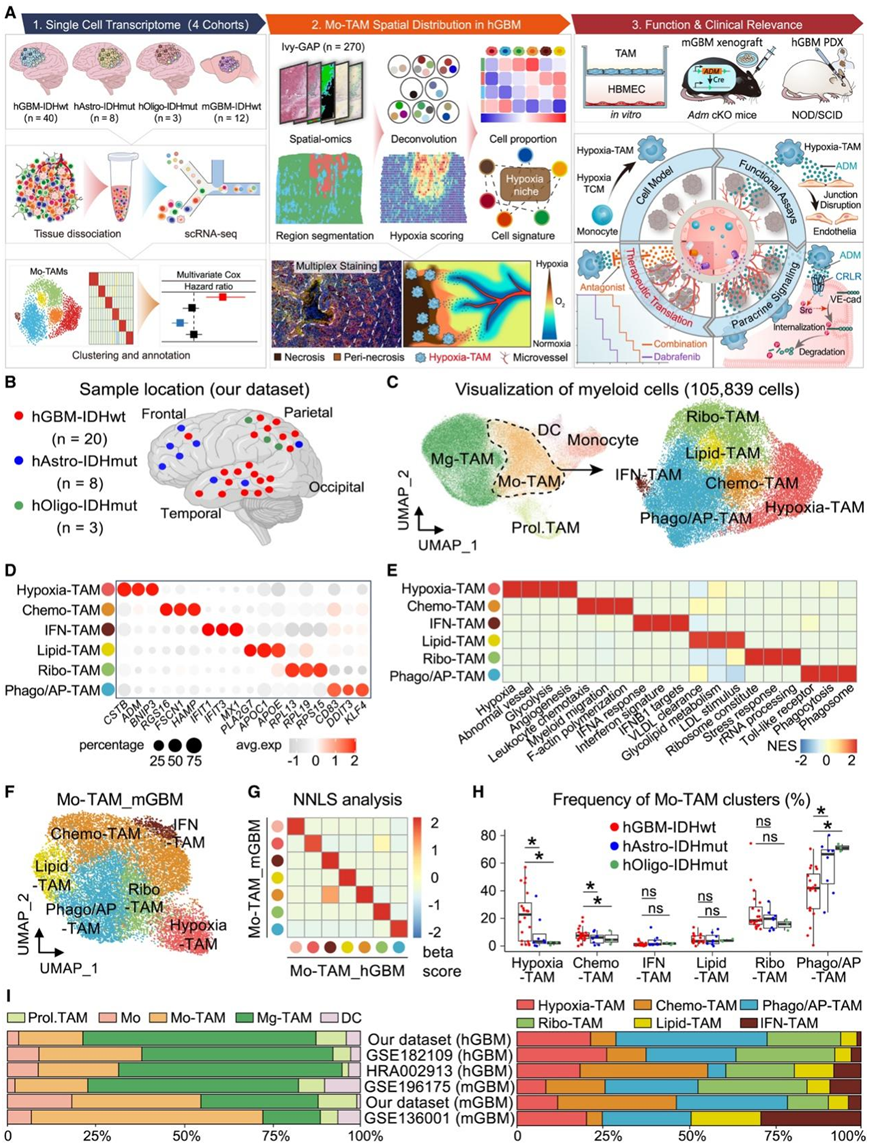 (A)实验流程。(B) scRNA-seq数据集中人类胶质瘤标本的位置。(C)UMAP 可视化。(D)细胞特异性标记点图。(E) Mo-TAM集群间基因集变异分析(GSVA)。(F)使用GL261 mGBM scRNA-seq数据集的Mo-TAM聚类的UMAP图。(G)非负最小二乘回归(NNLS)分析显示hGBM(横轴)和mGBM(纵轴)之间的Mo-TAM聚类具有相似性。(H)显示频率的箱形图。(I) hGBM和mGBM中骨髓细胞类型(左)和Mo-TAM细胞聚类(右)细胞组成的堆叠柱状图。