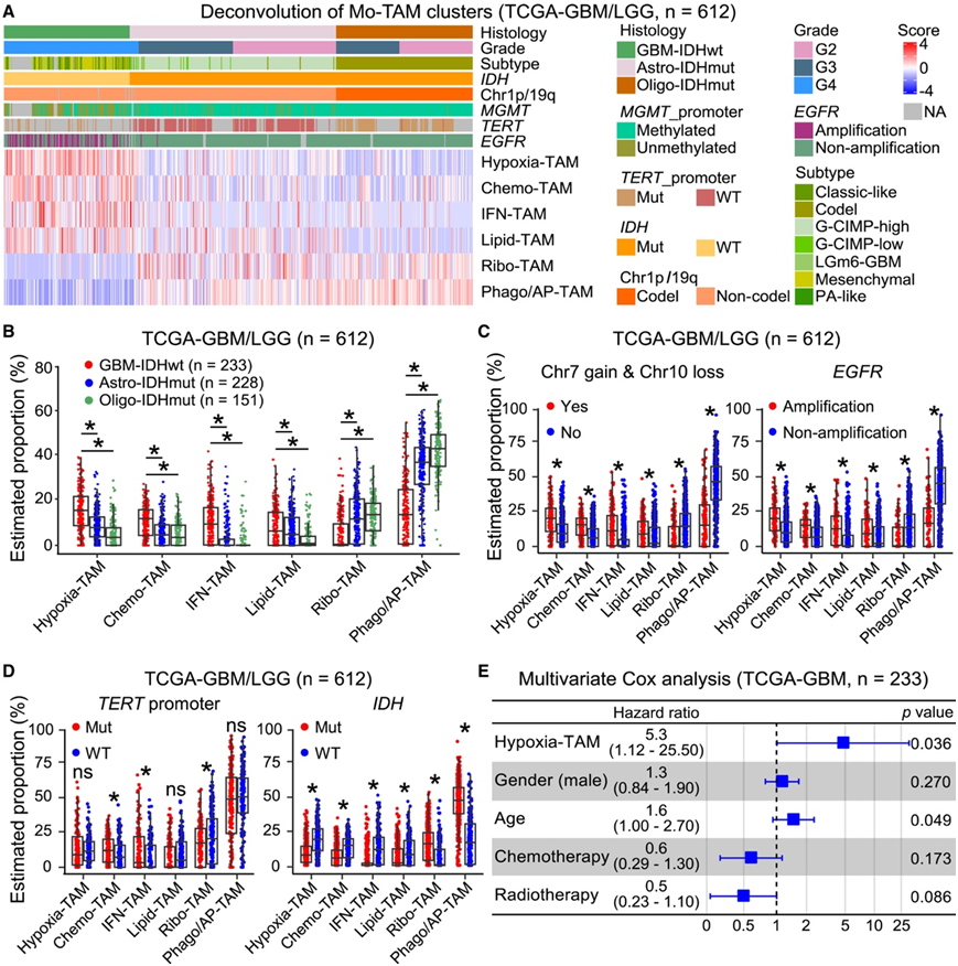 (A) 热图描绘了使用 TCGA-GBM/LGG 队列在弥漫性神经胶质瘤中不同 Mo-TAM 聚类的估计比例。(B–D) 箱线图显示使用 TCGA-GBM/LGG 队列在不同类型或分子特征的弥漫性胶质瘤中 Mo-TAM 聚类的估计比例。(E) 使用 TCGA-GBM 队列对患者总生存期进行多变量 Cox 回归分析。