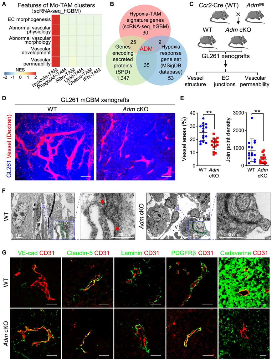 (A) hGBM scRNA-seq 数据的 GSVA 显示缺氧 TAM 富集的通路。(B) 来自 hGBM scRNA-seq 数据集的 Hypoxia-TAM 特征基因的子集、来自基于网络的分泌蛋白数据库 (SPD) 的分泌蛋白编码基因以及来自 MSigDB 的缺氧反应基因集。(C) Ccr2 -Cre-eGFP (WT) 小鼠和Adm cKO 小鼠的生成以及随后对 GL261 mGBM 异种移植物中肿瘤血管的评估的示意图。(D-E) WT 和Adm cKO 异种移植物中葡聚糖标记的肿瘤脉管系统的活体成像以及血管结构的定量。(F) 异种移植物中微血管的透射电子显微镜 (TEM)分析。(G) 异种移植物中 VE-钙粘蛋白、claudin-5、层粘连蛋白、PDGFRβ、尸胺和 CD31 的免疫染色分析。