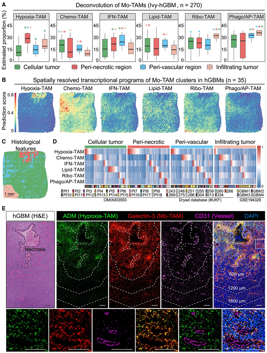 (A) 箱线图显示使用 Ivy-hGBM 队列的bulk RNA-seq 数据估计 hGBM 不同组织学区域中 Mo-TAM 聚类的估计比例。(B) 表面图显示使用三个公开 hGBM 空间转录组数据集在空间分辨率下跨 Mo-TAM 聚类的转录程序。(C) hGBM 的注释组织学特征。(D) 使用公开 hGBM 数据集按不同组织学区域排列的空间转录组热图。(E) hGBM 坏死周围区域 ADM、galectin-3 和 CD31 的 H&E 染色和免疫染色。