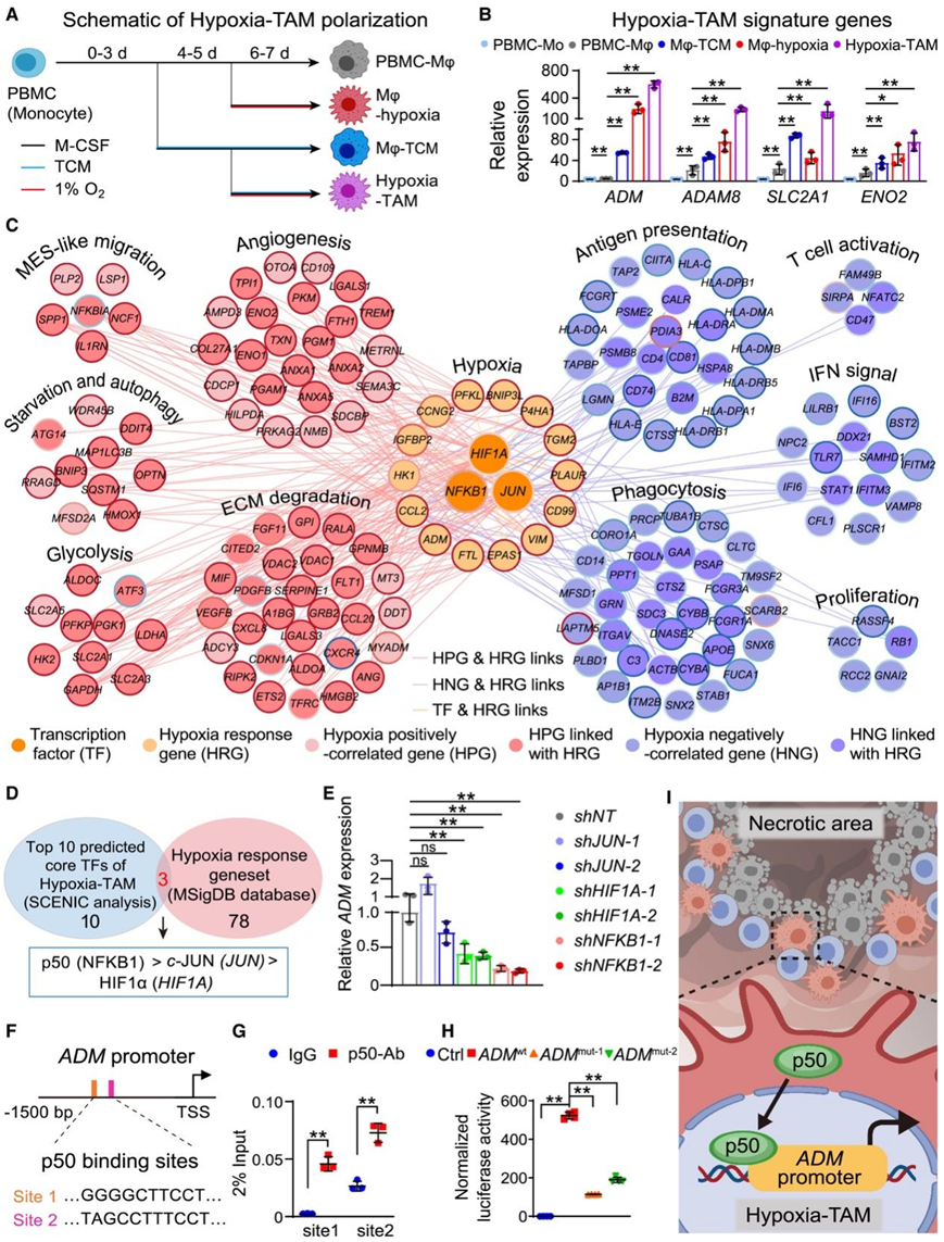 (A) 单核细胞极化至不同 Mφ 状态的示意图。(B) Hypoxia-TAM 特征基因表达的 qRT-PCR 分析。(C) 网络图说明缺氧相关基因相互作用和缺氧-TAM 的通路富集。(D) Hypoxia-TAM 和缺氧反应基因组的预测核心 TF 的子集。(E)对 PBMC 衍生的 Hypoxia-TAM 表达靶向JUN、HIF1A和NFKB1的 shRNA 中ADM表达进行 qRT-PCR 分析。(F) ADM基因启动子上 p50 结合位点的示意图。(G) 使用 PBMC 衍生的缺氧 TAM 对 p50 进行 ChIP-qPCR。(H) 在 PBMC 衍生的缺氧 TAM 中进行荧光素酶报告基因分析。(I) Hypoxia-TAM 中p50 介导的ADM转录的示意图。