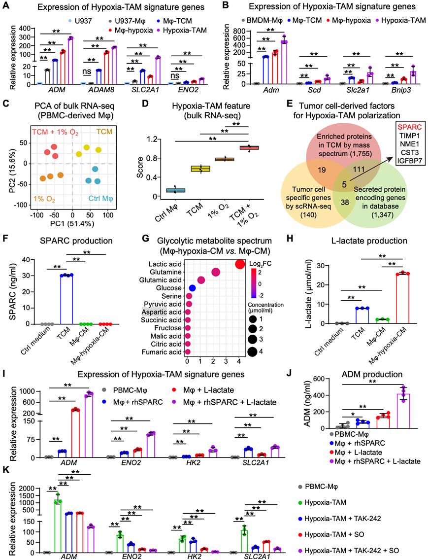 (A-B)qPCR分析。(C)主成分分析(PCA)。(D)缺氧- TAM特征基因在差异极化体Mφ中的平均表达分数。(E)利用hGBM scRNA-seq数据集鉴定出TCM中富集蛋白、编码分泌蛋白的人类基因以及在肿瘤细胞中优先表达的人类基因的亚群。(F)酶联免疫吸附试验(ELISA)分析。(G)气泡图显示Mφ-hypoxia-CM组与Mφ-CM组糖酵解代谢谱的变化。(H) L-乳酸测定法测定的分泌L-乳酸浓度。(I) qRT-PCR分析。(J) ELISA法测定PBMC衍生的Mφ在指定刺激下产生ADM的浓度。(K) qRT-PCR分析。