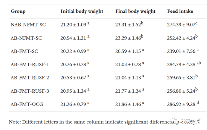 小鼠的初始体重无显著差异(表1)。实验结束时,未接受粪便菌群移植的小鼠体重明显高于其他小鼠(p<0.05)。除AB-FMT-OCG组外,粪便菌群移植小鼠采食量无显著差异。