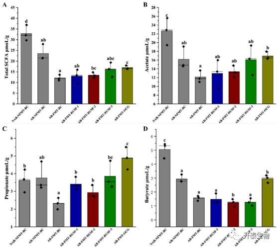 结果表明,抗生素处理显著降低了小鼠结肠中乙酸盐、丁酸盐和总SCFA含量(p<0.05),且FMT处理并未改变该趋势(图3)。不同食物组的结果表明,饮食影响结肠SCFA的含量。与AB-FMT-SC组相比,AB-FMT-RUSF-1和AB-FMT-RUSF-3组丙酸盐含量显著增加,AB-FMT-RUSF-2组丙酸盐、丁酸盐和总SCFA含量显著增加,AB-FMT-OCG组乙酸盐、丙酸盐、丁酸盐和总SCFA含量显著增加(p < 0.05)。与AB-FMT-OCG组相比,AB-FMT-RUSF-1组丙酸盐、丁酸盐和总SCFA含量显著降低,AB-FMT-RUSF-2组丙酸盐含量和AB-FMT-RUSF-3组丁酸盐含量显著降低(p < 0.05)。