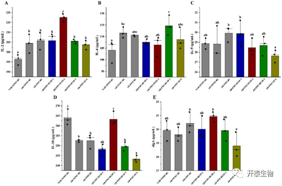 (A)血清中的IL-2;(B)血清中的IL-4;(C)血清中的IL-9;(D)血清中的IL-10;(E)血清中分泌的免疫球蛋白A(sIgA)。数据表示为平均值±标准偏差(n = 3)。不同的上标字母表示显著差异(p < 0.05)。