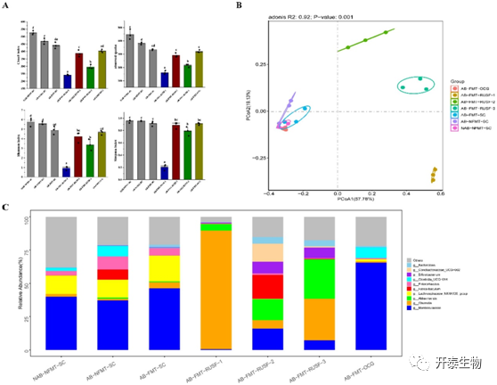 结果表明,抗生素处理显着降低了小鼠肠道微生物群的丰富度(p < 0.05),但对多样性没有显着影响(图4A)。FMT处理没有保持抗生素对肠道微生物群丰富度的影响趋势。与AB-FMT-SC组相比,AB-FMT-RUSF-1和AB-FMT-RUSF-3组肠道菌群的丰富度和多样性显著降低,AB-FMT-RUSF-2和AB-FMT-OCG组肠道菌群的丰富度和多样性相似。此外,以permanova为结果的β多样性分析可以观察到,同一组中样本的聚合性良好,组内差异较小(图4B)。NAB-NFMT-SC、AB-NFMT-SC、AB-FMT-SC和AB-FMT-OCG组之间的距离差异无统计学意义,但与AB-FMT-RUSF-1、AB-FMT-RUSF-2和AB-FMT-RUSF-3组之间的距离存在显著差异。