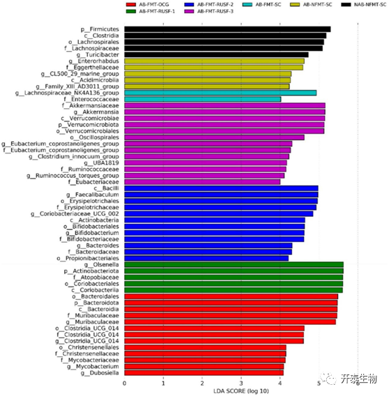LEfSe分析最终显示55个优势类群(从门到属水平),包括NAB-NFMT-SC组的5个优势类群,AB-NFMT-SC组中的5个优势类群,AB-FMT-SC组中的2个优势类群,AB-FMT-RUSF-1组中的5个优势类群,AB-FMT-RUSF-2组中的12个优势类群,AB-FMT-RUSF-3组中的13个优势类群和AB-FMT-OCG组中的13个优势类群(图5)。结果表明,AB-FMT-RUSF-1组中的Olsenella比AB-FMT-RUSF-2组中的Faecalibaculum,Coriobacteriaceae_UCG-002和Bifidobacterium、AB-FMT-RUSF-3组中Akkermansia和AB-FMT-OCG组中Muribaculaceae所占优势菌种程度更为显著。