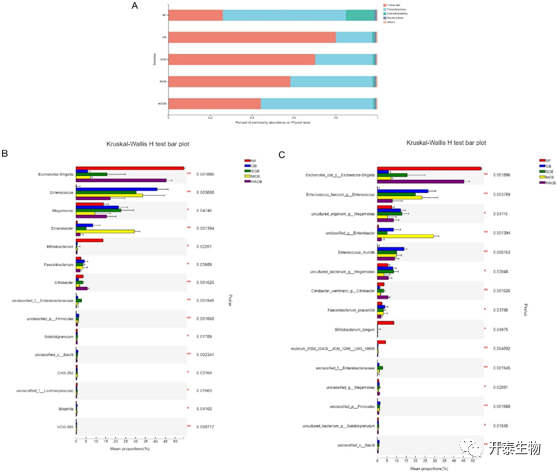 图5 微生物在门(A)、属(B)、种(C)水平下的群落组成及相对丰度分布图。*p<0.05,**p <0.01,***p <0.001。