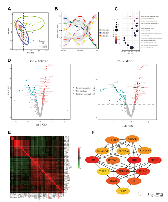 A.偏最小二乘法-DA图。B.从SG/CAG到IM/LGIN再到GC的蛋白质变化轨迹。C.前15个蛋白质的富集化途径。D.与SG/CAG(左)或IM/LGIN(右)相比,共有43个与GC显著相关的DEP。正相关的蛋白质(OR>1)用红色表示,负相关的蛋白质(OR<1)用蓝色表示。E. 43个DEPs的Pearson相关性分析。F. PPI网络。