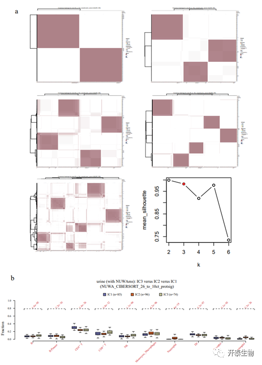 根据每个患者免疫细胞的估计比例得出三个免疫簇(IC)(图6a),三者中10个主要免疫细胞的丰度在统计学上都有显著差异,中性粒细胞具有最低的P值(图6b)。而且他们在免疫细胞类型上有不同特征,IC1以高比例的CD4+T细胞和树突状细胞为特征,IC2以丰富的嗜酸性粒细胞和中性粒细胞为特征,IC3以丰富的CD8+T、NK细胞和B细胞为特征(图5b,6b)。