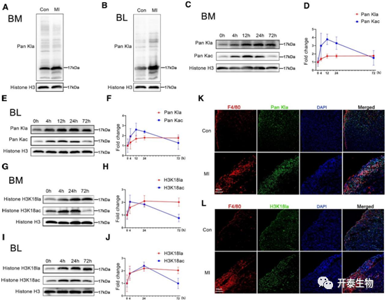 A-B,MI小鼠单核细胞乳酸化水平;C-F,MI小鼠不同时间段单核细胞乳酸化和乙酰化水平;K-L,MI小鼠单核细胞H3K18la和H3K18ac变化。