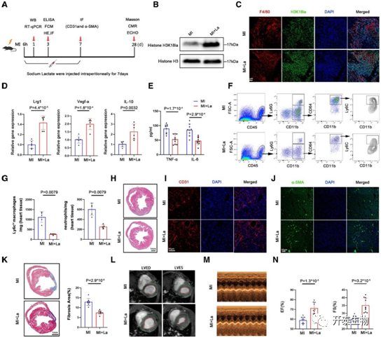 A-D,MI小鼠模型使用乳酸盐治疗H3K18la、Lrg1、Vegf-a和IL-10 mRNA水平升高;E-H,炎症浸润受阻;I-N,MI后血管生成和心脏重塑。
