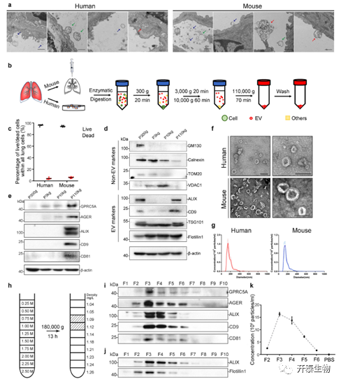 作者为了从正常肺组织中收集高质量的EV,开发并优化了一种基于差速离心的方案。人和小鼠中消化后的活细胞分别占总细胞的96.2%和94.2%。这表明,肺细胞在消化过程中得到了很好的保护。WB结果表明,在小鼠样本中,EV相关蛋白(ALIX、TSG101、CD9、CD81)在110000×颗粒(P110kg)中高度富集,而高尔基体(GM130)、内质网(Calnexin)和线粒体蛋白(TOM20)在P110kg部分中检测不到或仅微弱存在。人类样品 P110kg 部分中 EV 标记蛋白存在类似富集,并且囊泡的相似形态和大小分布与已知的 EV 特征一致。(图1)。