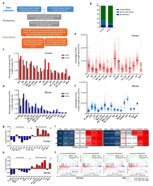 作者选择高丰度EV蛋白并生成热图。结果表明,肺EV中的蛋白质可以反映其细胞来源。在人类和鼠类样本中,ATIIs(II型肺上皮细胞)可以标记大多数EVs,表明ATIIs是肺组织EVs的主要来源。人类样本中单个成纤维细胞释放的EVs最多,而小鼠样本中的ATI细胞释放的最多。与免疫细胞相比,更多的EVs来源于单个非免疫细胞。GSEA结果表明所有非免疫细胞中的EV分泌相关基因的显著富集。非免疫细胞中EVs分泌相关基因的上调意味着更强的释放EVs的能力(图3)。