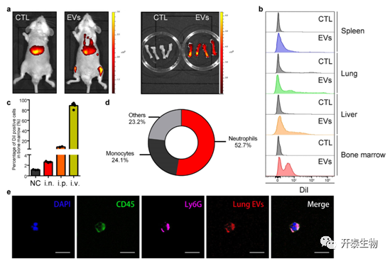 流式结果表明,与对照小鼠相比,注射肺EVs的小鼠的下肢显示出高荧光信号。相对于对照小鼠,注射DiI标记的EV的小鼠的骨髓中检测到更多的红色荧光。不同给药途径不影响肺EVS在骨髓中的积聚,通过静脉注射在骨髓中检测到更多具有红色荧光的细胞,表明肺EVS通过血管转移。骨髓中的红色荧光细胞随后鉴定为主要是中性粒细胞(52.7%)和单核细胞(24.1%)。用红色荧光标记的肺EV与鉴定为CD45+Ly6G+细胞的中性粒细胞共定位(图5)。
