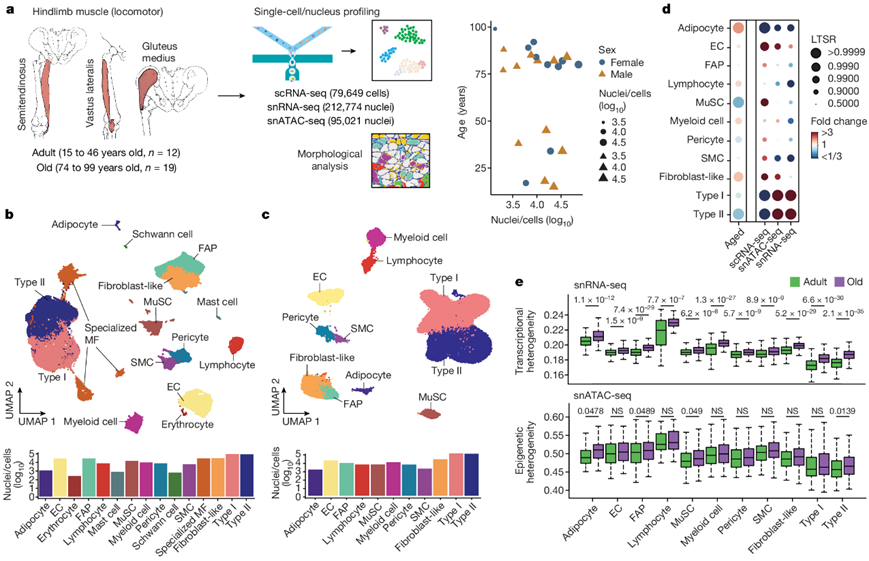 为了研究人类骨骼肌随着衰老发生的分子变化,研究者团队对来自西班牙和中国的31名参与者(17名男性和14名女性)进行了后肢肌肉活检,分为两个年龄组:成年组(15至46岁)和老年组(74至99岁),男女年龄中位数分别为36岁和84岁(图1a)。将每个活检组织分为不同的样本,(1)用多聚甲醛固定进行组织学检测;(2)液氮快速冷冻单细胞核RNA测序(snRNA-seq)和单细胞核转座酶可及染色质测序(snATAC-seq);(3)单细胞RNA测序(scRNA-seq)。UMAP可视化显示了多核肌纤维室中代表I型和II型和特化肌核的聚类。在单核细胞中,主要的肌肉细胞类型是MuSC,基质细胞(FAP,成纤维样细胞和脂肪细胞),血管细胞(周细胞、平滑肌细胞和内皮细胞),免疫细胞(髓样,淋巴样和肥大细胞)和神经胶质细胞(雪旺细胞)(图1b)。对snATAC-seq数据的分析显示了对主要细胞类型的可靠鉴定(图1c)。广义线性混合模型显示,与年龄相关的 肌核减少,尤其II型肌纤维、MuSC和周细胞,以及与年龄相关的脂肪细胞、成纤维细胞样细胞和免疫细胞增加(图1d)。他们注意到大多数细胞类型在单个细胞/细胞核之间表现出转录异质性增加,这是衰老的一个新特征(图1e)。