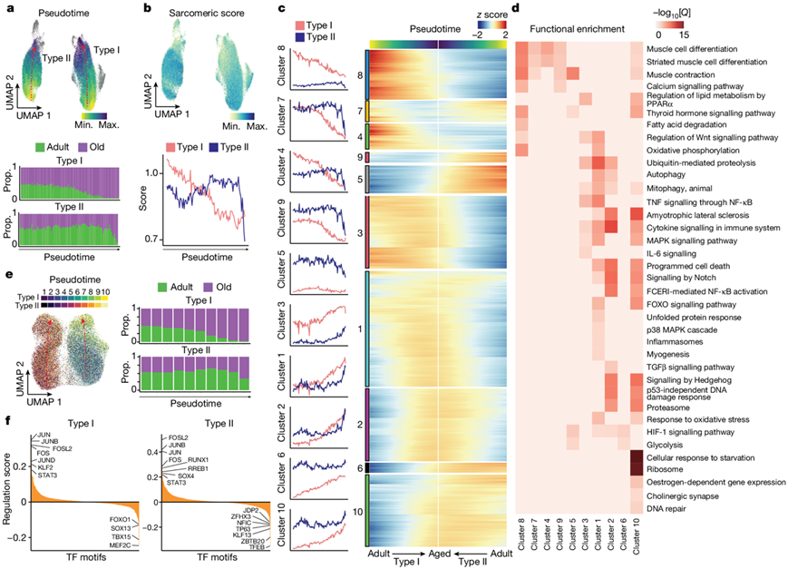 为了研究肌纤维转录变异的方向性,他们进行了伪时间细胞轨迹分析,观察了 I 型和 II 型肌核随衰老的确定路径(图3a)。这些肌核的轨迹终点与主要出现在老化肌肉中的新群体的转录谱相对应。当绘制受衰老逐渐影响的特定骨骼肌功能(分组为分数)时,例如肌节或萎缩相关基因(图3b),随着年龄的增长,I型肌核的变化轨迹是渐进的,而II型肌核的变化轨迹是突然的(图3a)。这种差异与 II 型肌纤维对衰老的敏感性更高相一致,这导致它们优先损失。相比之下,I 型肌纤维持续存在于衰老的肌肉中,并积累渐进性损伤,随着时间的推移进一步加剧肌肉功能障碍。伪时间的进一步分析显示了10个主要的转录变异聚类,其中大多数分别反映了I型或II型肌纤维的进行性或突发性变性过程(图3c)。例如,炎症小体(NFKB1、TXNIP),自噬(NBR1、ATG7)和氧化应激反应(SOD2、NFE2L2)基因的轨迹在I型肌核中稳步增加,但在II型肌核中急剧增加(聚类1)。在I型和II型肌纤维(聚类1、2和10)中,促萎缩Notch信号(HES1、NOTCH2)随着年龄的增长呈现相似的趋势。在I型肌核中,IL-6信号(IL6ST、SOCS3)的表达随着年龄的增长而明显上调(聚类3)此外,两种肌纤维类型均表现出增强的去神经特征(胆碱能突触;ITPR1、GNG12)(聚类10)。