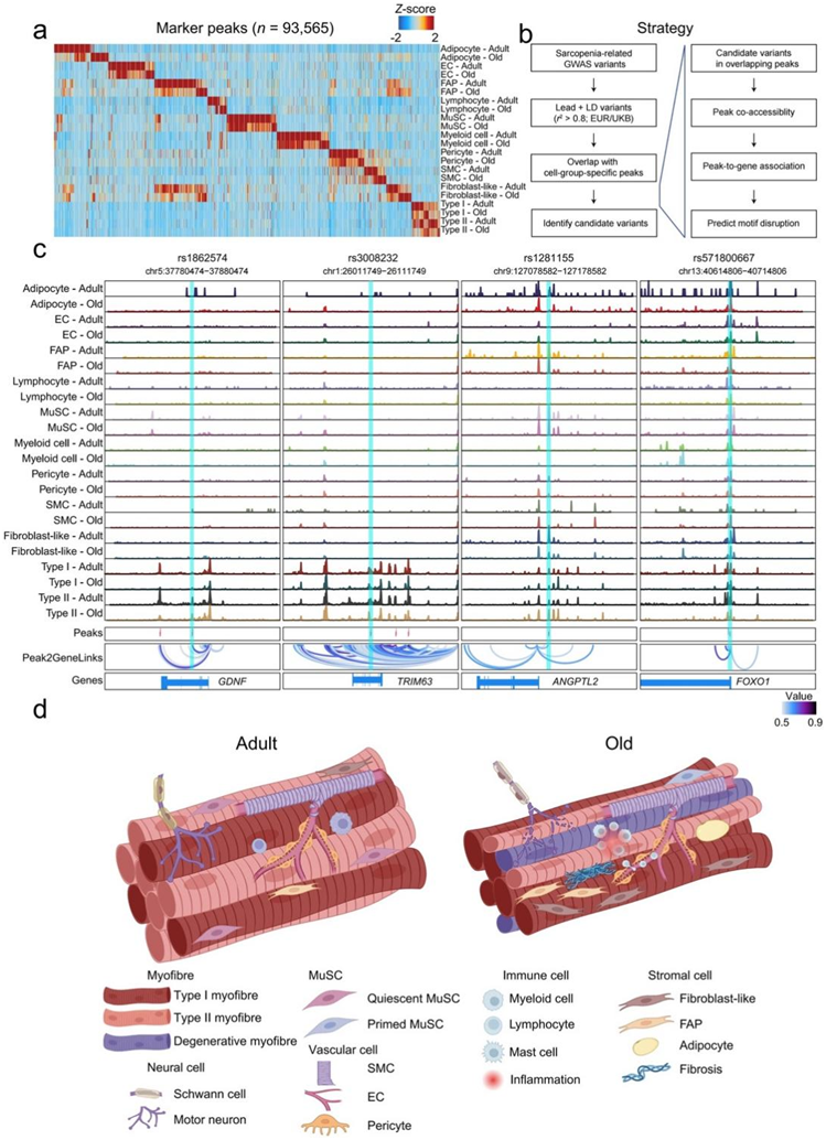 通过整合来自不同细胞类型和年龄组的所有细胞核的片段,他们生成了一个包含636363个峰的联合峰集,其中,从所有测试个体中鉴定出93565个富含单个细胞类型的峰(图S13a)。成年组和老年组在这些峰的开放度方面表现出相似性和差异,强调表观遗传改变可能是肌肉衰老和肌肉减少症的重要驱动因素。他们进行了连锁不平衡 (LD) 评分回归 (LDSC) 分析(图6a),虽然瘦体重(lean body mass)特征如预期在 II 型肌核中富集,但与肌肉力量相关的特征却出乎意料地在衰老的成纤维细胞样细胞和 FAP 中富集,但在肌纤维中却没有富集,遗传变异可以通过改变细胞间通信网络来促进肌肉减少症。老年人的腿部阻抗与 MuSC 高度相关,单纯跌倒导致的骨折与成人 MuSC 和老年 II 型肌核相关。此外,他们注意到睡眠时间、肌酐和空腹血糖与肌纤维相关,表明这些细胞群在昼夜节律调节和代谢调节中的潜在作用。