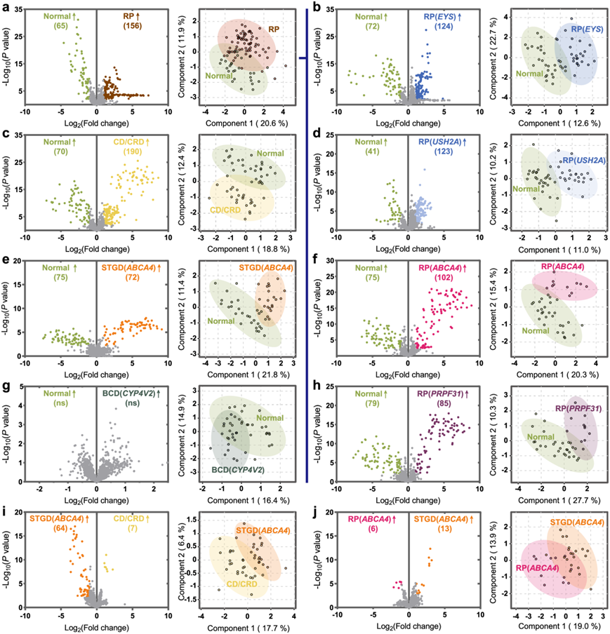 (a, c, e)PLS-DA图显示,在代谢组学分析中,RP、CD/CRD和STGD组可以与对照组区分。(b, d, f, h)当进一步按基因型对RP进行分组时,包括EYS, USH2A, ABCA4和PRPF31,代谢组学分析显示在PLS-DA图中有更多的区分结果。(g)BCD组的重叠区域更为突出。(i) CD/CRD与STGD相比较,有71个特征与火山图有显著差异,PLS-DA图可区分两组特征。(j) 与RP和ABCA基因型相比,STGD仅鉴定出火山样地的19个特征,且PLS-DA样地重叠突出。