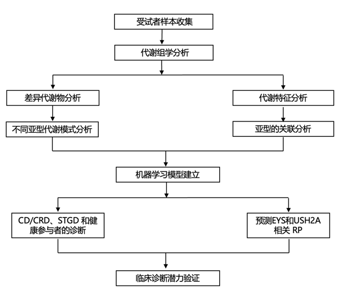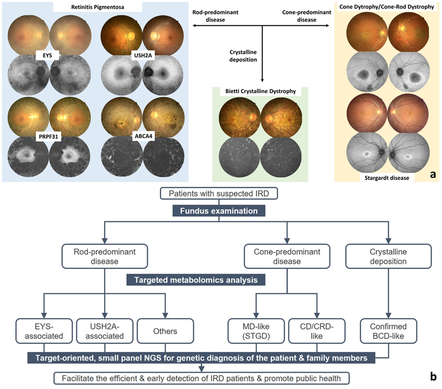 (a) 不同基因型的RP不能通过眼底检查来区分,其共同特征是视盘苍白、血管变细、色素改变,只是病情严重程度不同。 (b) 流程图显示通过结合临床信息、代谢组学分析和基因诊断来促进 IRD 的早期诊断。